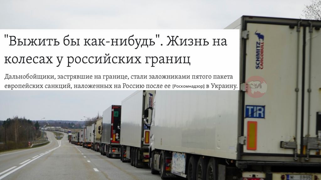 После санкций российские и белорусские дальнобойщики из-за большой очереди на европейских границах застряли там без денег, связи и даже средств гигиены - они живут за рулём, но фактически уже остались без работы. Кто работал на компании - выживают на последние деньги и говорят, что проблем стало больше, чем заказов. Те, кто доставлял грузы на своих машинах, выставляют их на продажу.