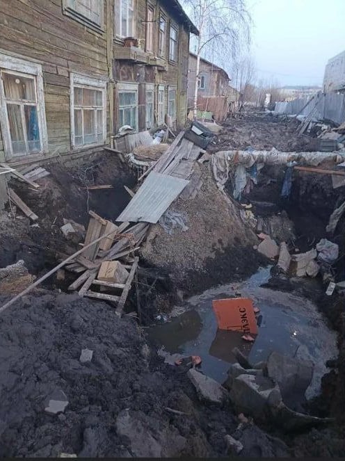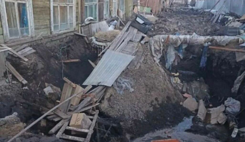 Сегодня прокуратура Якутска проверила жалобу жильцов — их дом уже начал частично проваливаться в котлован: в яму рухнули завалинки дома, сломана канализационная труба.