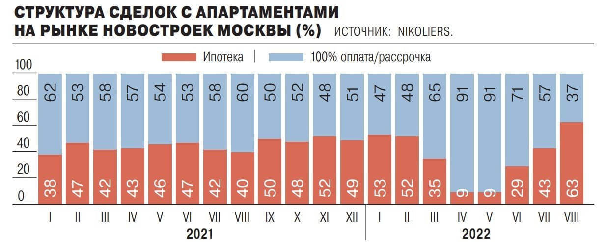 Наиболее чувствительным сегментом рынка столичных новостроек оказались апартаменты. Спрос на них в апреле—августе текущего года упал почти вдвое год к году из-за высоких ставок по ипотеке и снижения уровня доходов граждан.