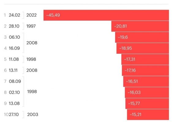 Падение индекса Мосбиржи продолжается, минус 45%, абсолютное значение 1 700 пунктов. Последний раз на этом уровне он был в начале 2016 года.