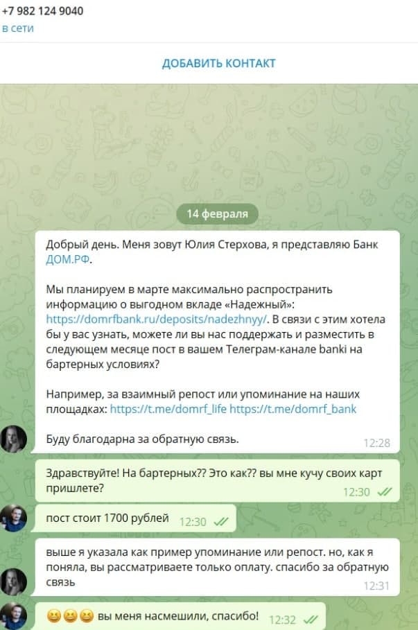 Генеральный директор Дом рф Виталий Мудко все еще продолжает красть деньги. Сейчас компания даже не может позволить себе пиар за 1700 рублей. Представители банка предлагают “взаимный репост” администраторам телеграмм каналов, игнорируя покупку рекламы.