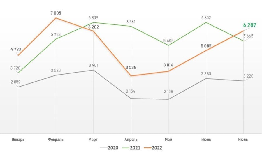 Количество регистраций договоров в отношении жилых и нежилых помещений в июле 2022 года вернулось к показателям марта (6282). По данным столичного Росреестра, в июле 2022 года число зарегистрированных ипотек на первичном и вторичном рынках Москвы достигло 8 тыс. и вернулось к показателю января этого года.