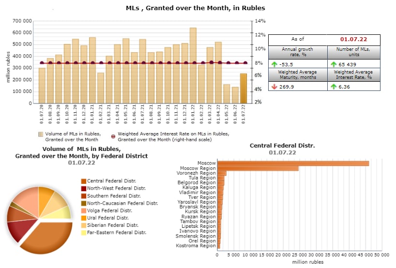 В июне количество выданных кредитов составило 65 тысяч. Объем выданных кредитов в июне составил 253 млрд. руб. (149 млрд. руб. первичный рынок и 104 млрд. руб. вторичный). Но годовая динамика отрицательная: - 53,5%.