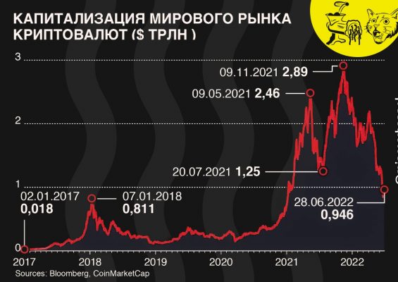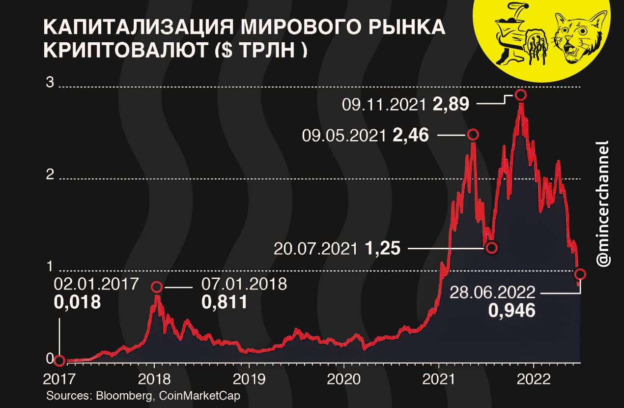 Мировой рынок криптовалют упал на 67% за семь месяцев - с $2,89 трлн в ноябре 2021 года до $0,95 трлн в июне 2022-го, подсчитали в Coinmarketcap. На графике видно, что криптопузырь раздулся после того, как ФРС с началом пандемии включила печатный станок. @mincerchannel