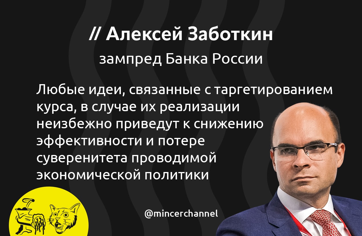 Зампред ЦБ Алексей Заботкин в ответ заявил, что переход к управлению курсом рубля приведет к росту инфляции и даже потере суверенитета экономической политики России. Про последнее слушать забавно, учитывая замороженные на Западе золото-валютные вложения РФ - как раз по причине необъяснимой любви ЦБ к Западу. @mincerchannel