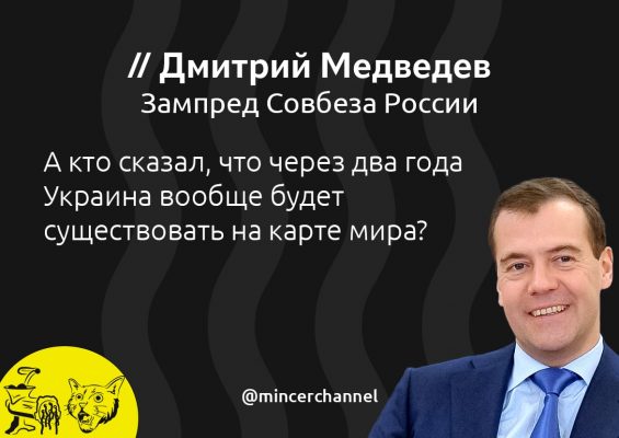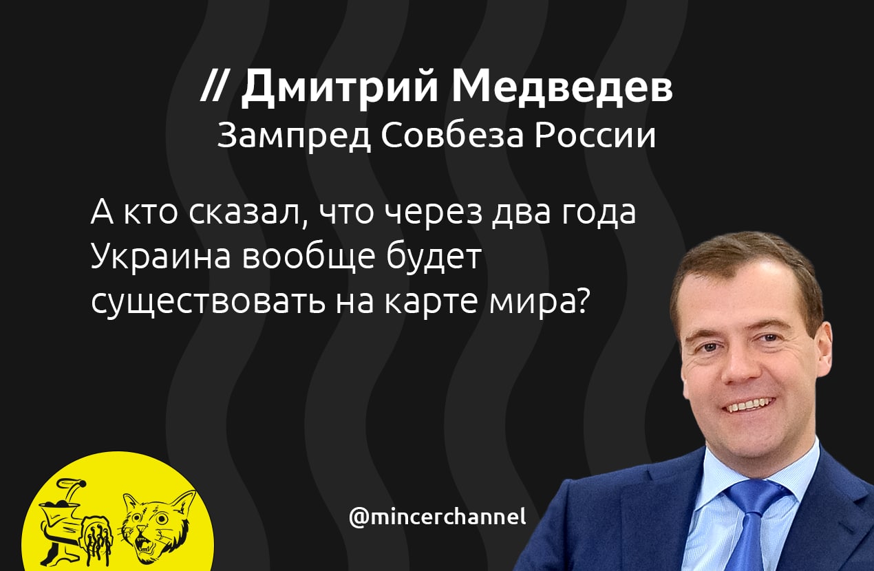 Зампред Совбеза России Дмитрий Медведев заявил, что Украина через пару лет может уже «не существовать на карте мира». Так он прокомментировал сообщения о желании украинской стороны договориться с США о поставках газа по ленд-лизу с условием его оплаты через два года. По мнению господина Медведева, вопрос сохранения украинской государственности не является значимым для США, заинтересованных исключительно в проекте «анти-Россия». @mincerchannel