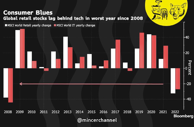 Bloomberg фиксирует крупнейшие с 2008 года распродажи акций мировых ритейлеров и IT-компаний. Если эти темпы сохранятся, то к декабрю падение превысит обвал 2008 года на 20-25% при оптимистичном сценарии, при жестком - почти в два раза. До краха доткомов в начале нулевых, конечно, далеко, но ситуация на фондовых рынках в этом году будет тяжелейшая. @mincerchannel