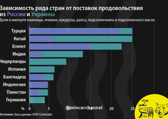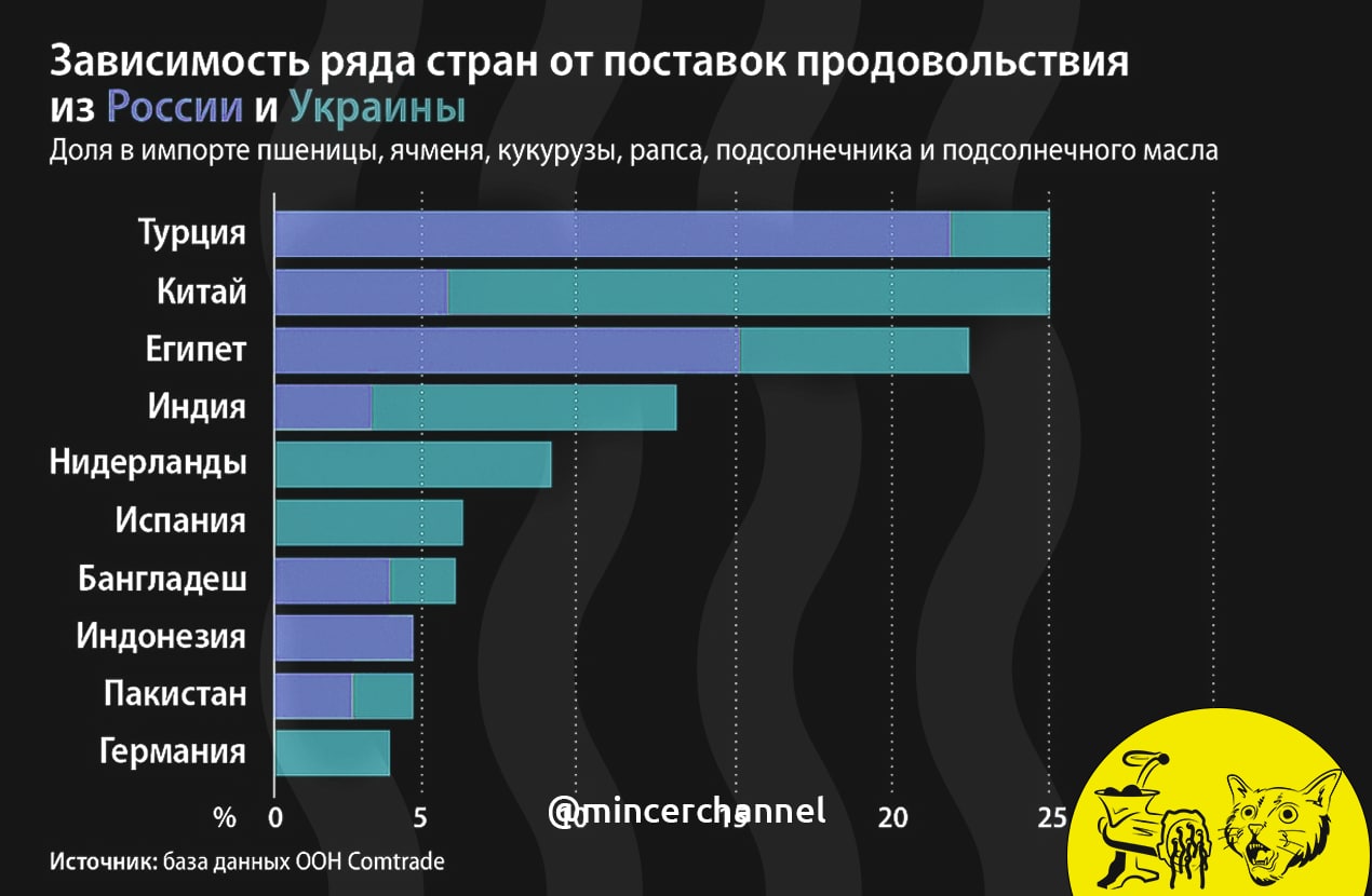 Зависимость ряда стран от поставок продовольствия из России и Украины доходит до 22% в структуре импорта. Ключевые рынки для РФ - Турция и Египет, для Украины – Индия и Китай. Они могут найти и других поставщиков, выкупив предложение на рынке по более высокой цене. Однако это ударит по бедным странам. @mincerchannel