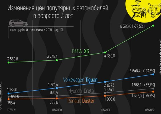 Динамика цен на самые популярные в России кроссоверы с пробегом, в возрасте 3 лет. @mincerchannel