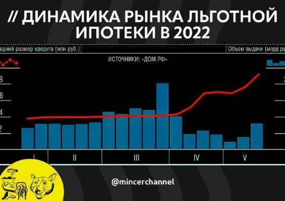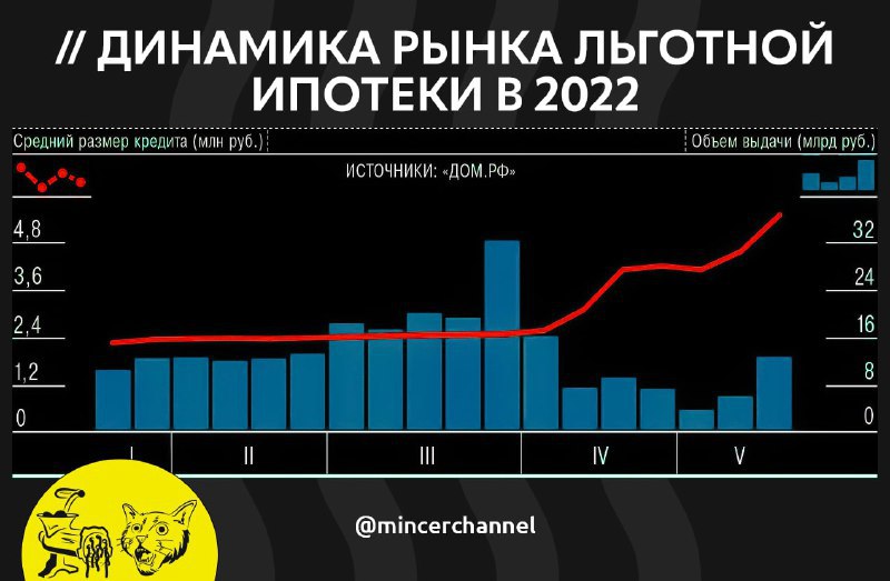 Рынок льготной ипотеки начал восстанавливаться: с 12 по 19 мая банки выдали максимальный с начала апреля объем кредитов — суммарно на 12,4 млрд руб. Средний чек также достиг нового максимума в 5,6 млн руб. Всего с конца апреля по 19 мая 2022 года было выдано 4,2 тыс. шт. кредитов на сумму 21,2 млрд руб. @mincerchannel