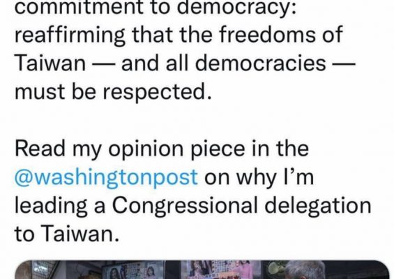 Нэнси Пелоси не просто прибыла на Тайвань, она, очевидно, еще привезла с собой партию медицинских масок. Во-всяком случае и она, и вся ее делегация явились с закрытыми лицами.