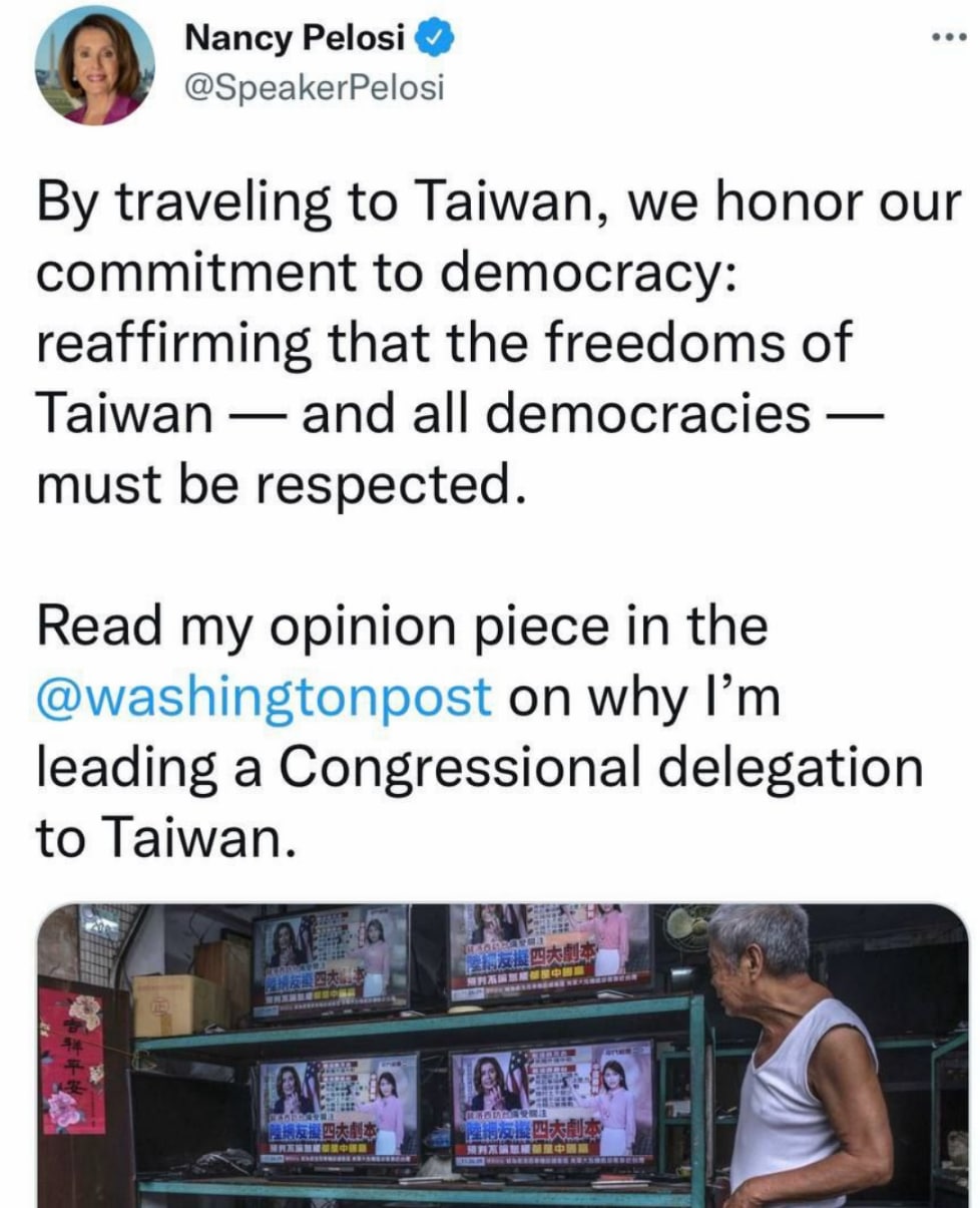 Нэнси Пелоси продолжает унижать Китай - после благополучного приземления написала в твиттере о том, что свободу Тайваня надо уважать. @mincerchannel