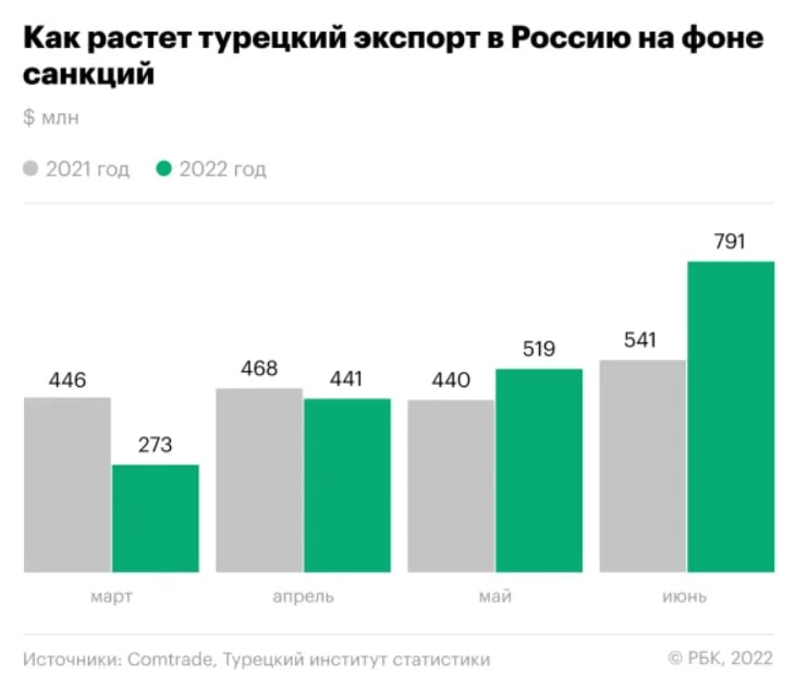 🇹🇷 Турция оказалась в выигрыше от санкций против России. Экспорт товаров Турции в Россию в июне подскочил на 46% в годовом выражении, до $791 млн. Скорее всего, это позволит ей выйти на четвертое место в списке крупнейших поставщиков товаров на российский рынок. @mincerchannel