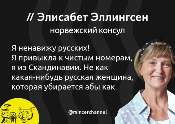 Норвежский консул Элисабет Эллингсен быстро забыла о европейских ценностях, когда в мурманском отеле ей, как и всем остальным посетителям предложили немного подождать, пока горничные закончат убираться в номере. Полиция начала проверку её высказываний. @mincerchannel