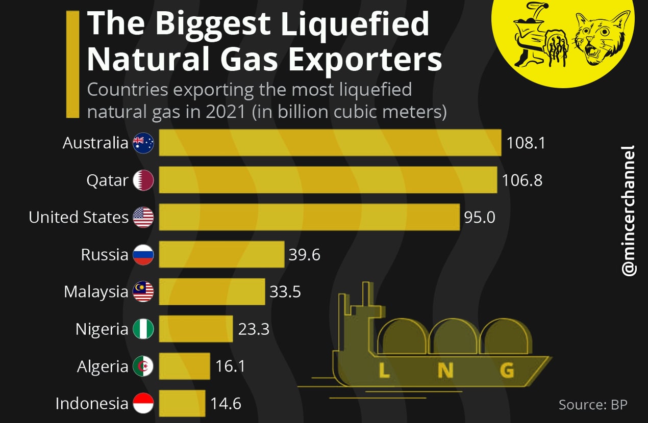 Россия по-прежнему в топ-5 крупнейших мировых экспортеров СПГ. Отказавшись от дешевого российского трубопроводного газа, Европа будет покупать дорогой СПГ у США и Катара. Ну или по совсем космическим ценам - из Австралии. Выбор небольшой, поэтому Катар уже начал пересмотр контрактов со странами ЕС в сторону увеличения цен, чтобы максимально заработать в этой ситуации. @mincerchannel