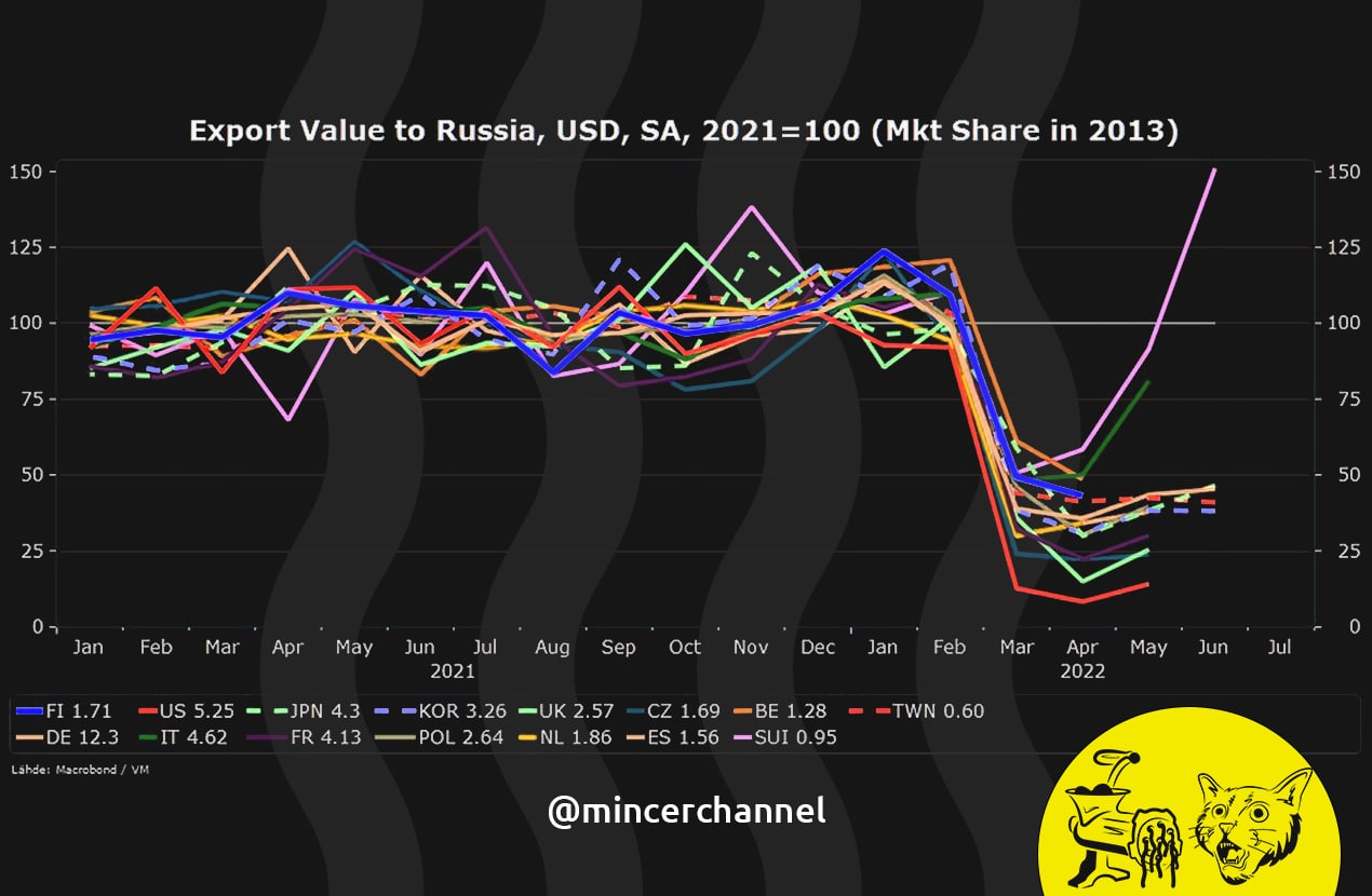 Экспорт из Швейцарии в Россию в последние два месяца испытывает настоящий бум. Скорее всего, именно через Швейцарию российским импортерам удалось наладить поставки критически важных европейских и американских товаров. @mincerchannel