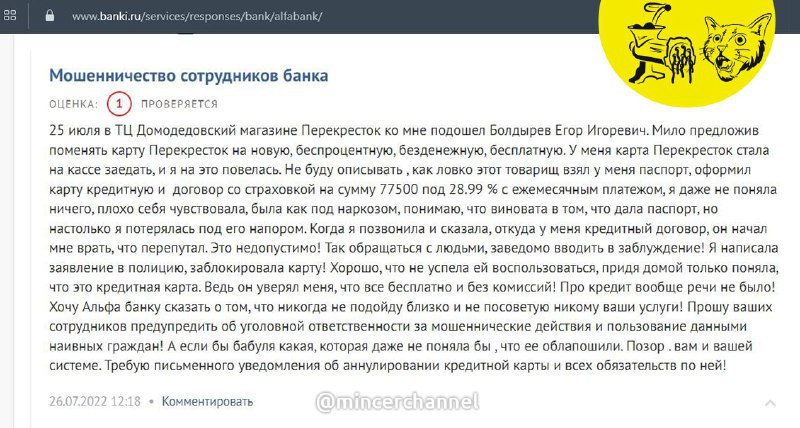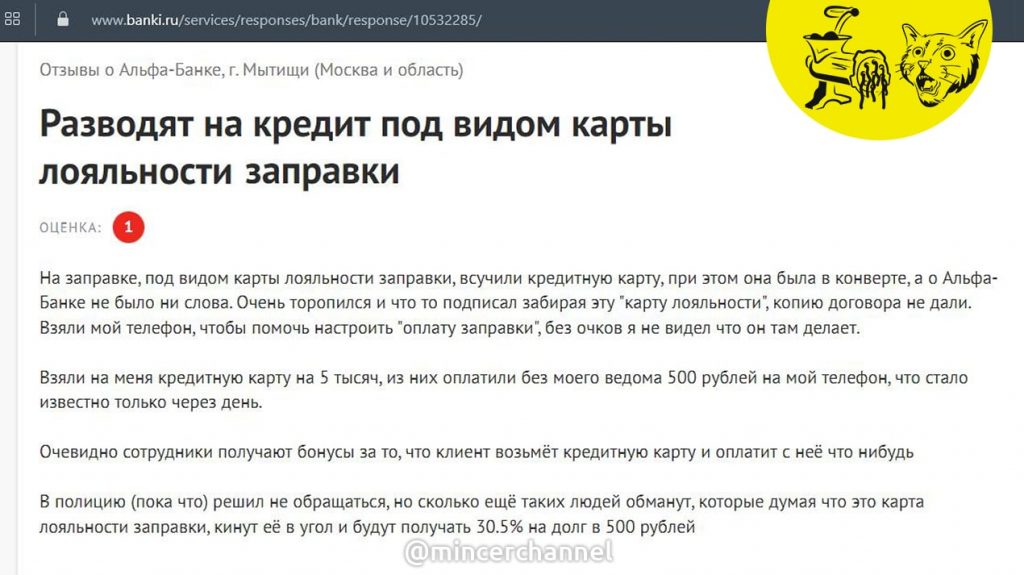 Так что, если увидите человека в красном – бегите от него, как от черта! Впрочем, говорят, что некоторые менеджеры Альфы выходят на охоту без опознавательных знаков, чтобы не отпугнуть лохов. Настолько уже плохая у банка репутация, что людей пугает один только их логотип. @mincerchannel