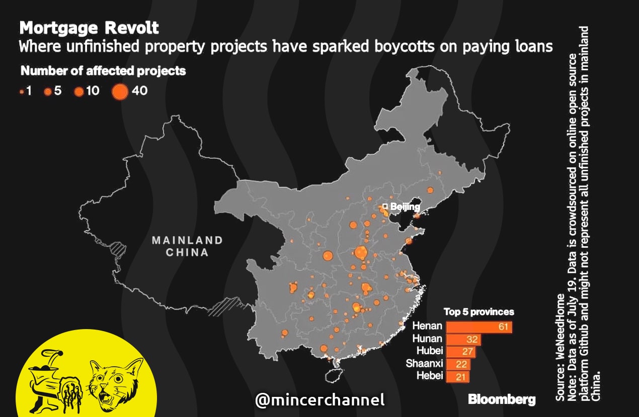 Карта «ипотечного бойкота» в Китае – отказ от выплат охватил минимум 301 жилой проект в 91 городе. Протестующие обвиняют застройщиков в том, что они задерживают срок сдачи квартир. Фактически это аналог российских «обманутых дольщиков».