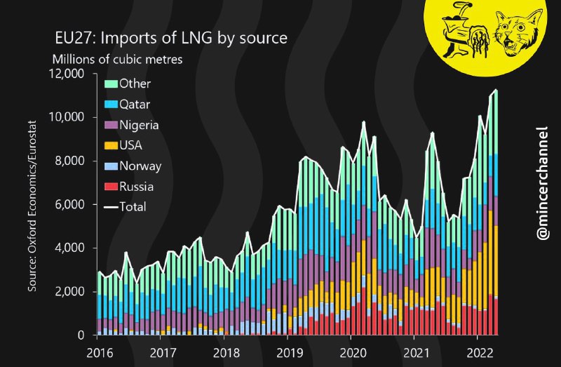 Однако почему-то все забывают, что Россия поставляет в ЕС и сжиженный природный газ - в структуре европейского импорта СПГ на нашу страну приходится до 15%. Если и этот объем изъять из рынка, в Европе будет настоящий армагедец. @mincerchannel