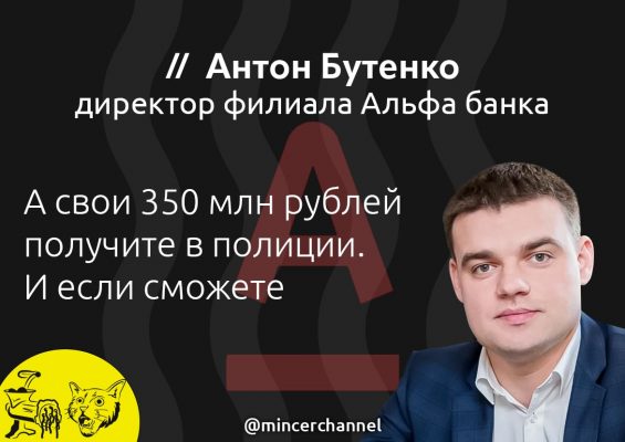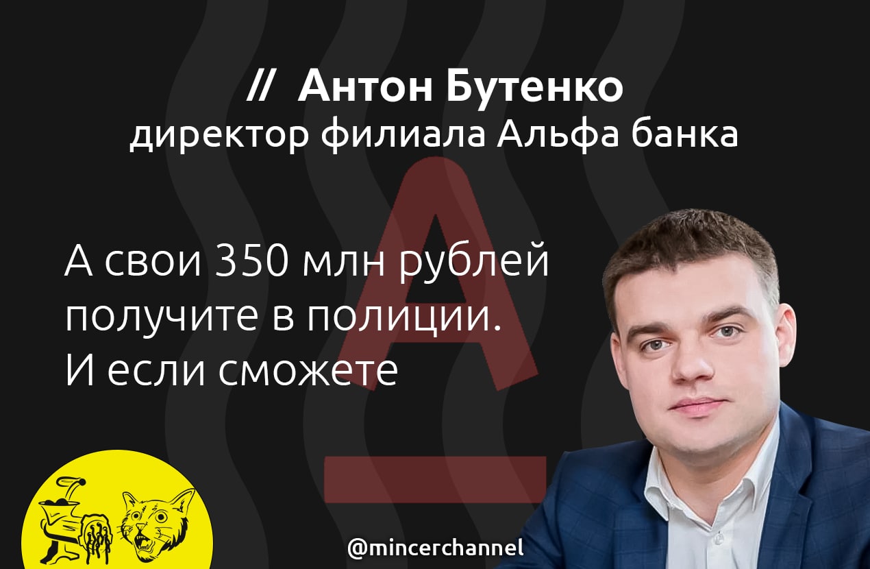 Дарья Рудюк, судя по всему, все берет на себя (и гуляет на свободе), однако пострадавшие уверены, что директор филиала и служба безопасности Альфа-банка - не просто в доле, но и являются организаторами этого мошенничества. Но их, судя по всему, прикрывают в центральном аппарате… @mincerchannel