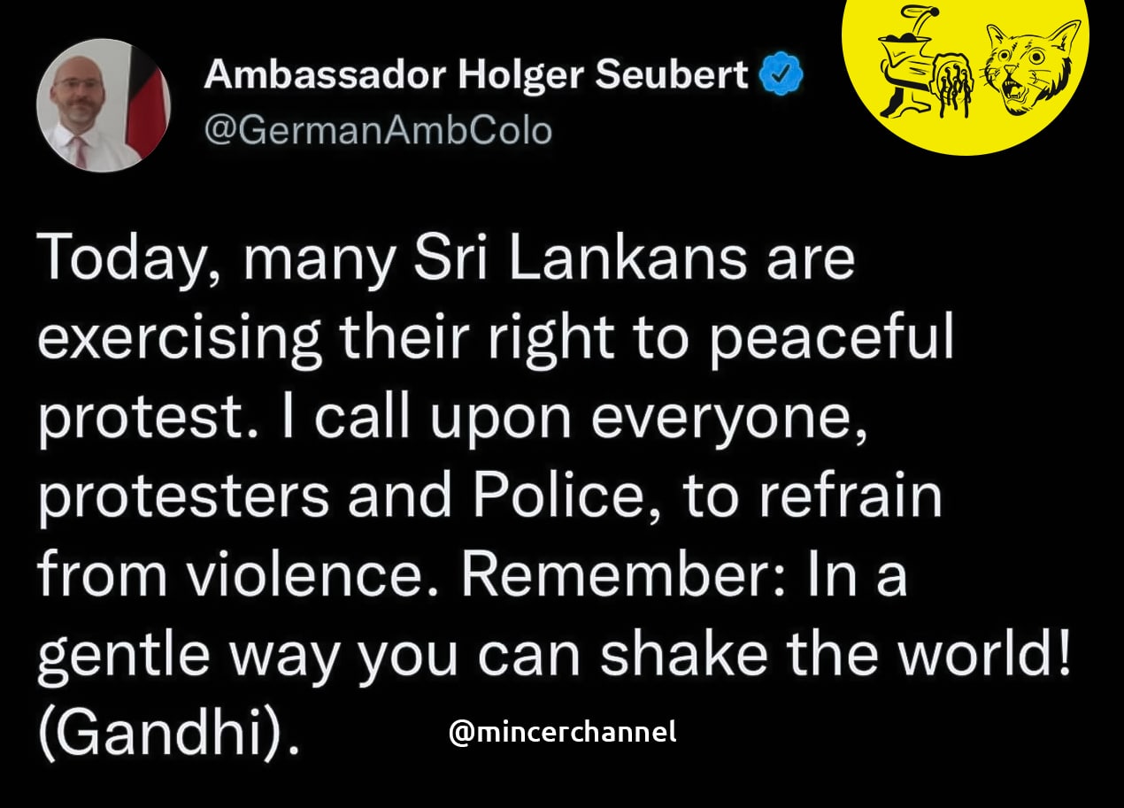 Посол Германии в Шри-Ланке увидел в штурме президентского дворца, в результате которого не менее 33 человек пострадали, «реализацию права на мирный протест» и процитировал Махатму Ганди "Действуя мягко, вы можете перевернуть мир»