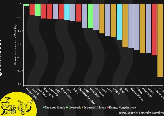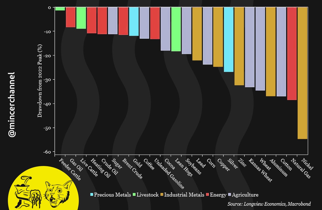 В инфографике - какие сырьевые товары сильнее всего подешевели от пиков в 2022 году. В лидерах падения промышленные металлы – никель, медь, цинк, алюминий, а также некоторые сельскохозяйственные товары. Это свидетельствует о завершении сырьевого суперцикла и вхождении в рецессию. @mincerchannel