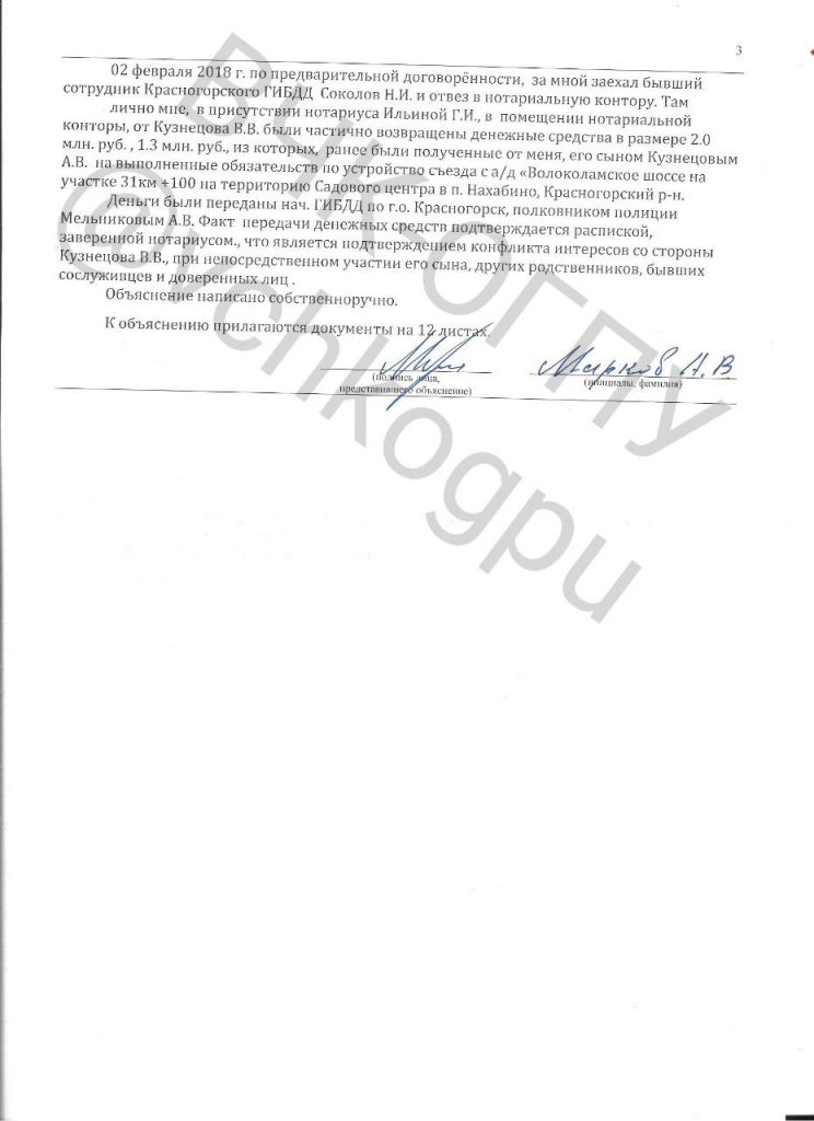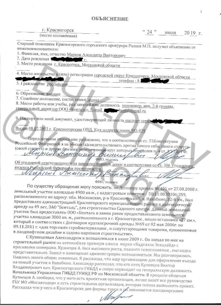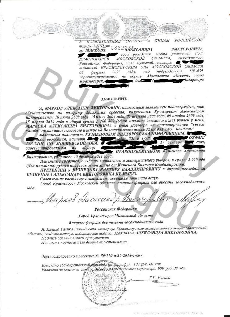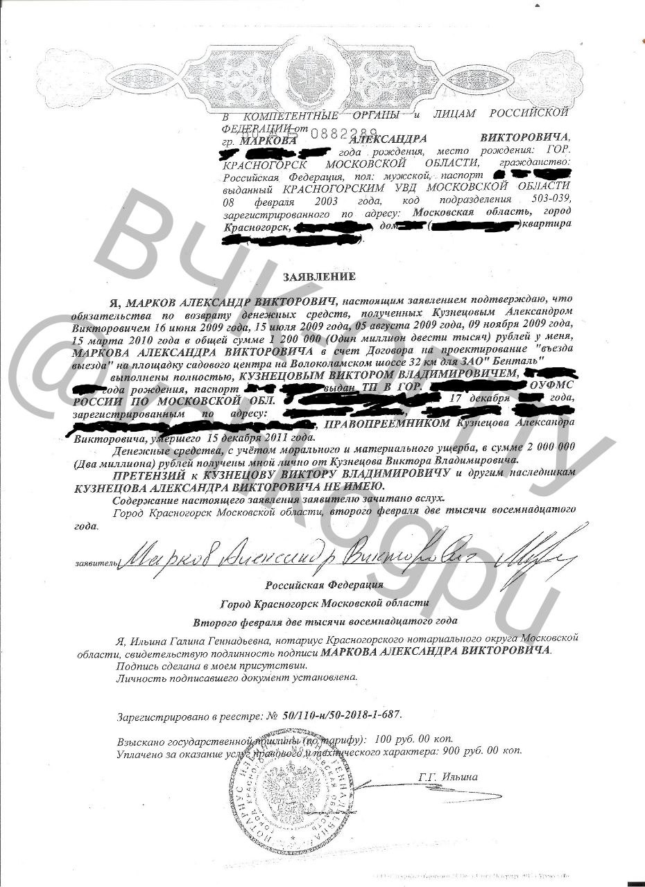 Однако, в декабре 2011 года Александр скоропостижно скончался, а после его смерти выяснилось, что проектная документация на согласование не представлялась, проведенные работы по строительству въезда на земельный участок выполнены без согласования с «Мосавтодор». Далее на Маркова А.В. выходит сват Кузнецова В.В. Самохин А.Н., который за 400.000 рублей вызвался получить для ООО «Бенталь» необходимое согласование и разрешительную документацию. В августе 2012 года Самохин А.Н. передал Маркову А.В. согласованный Кузнецовым В.В. (уже начальником ГАИ Московской области) проект. А уже в сентябре 2013 года по предписанию начальника ОГИБДД УМВД России по Красногорскому району (пришедшему «наследнику» Кузнецова В.В.) «Мосавтодор» ликвидировал въезд на территорию садового центра. Осознавая трудность сложившейся ситуации, Марков А.В. неоднократно предпринимал безуспешные попытки связаться с Кузнецовым В.В. для возврата переданных Александру денежных средств. После официального обращения на имя начальника ГИБДД Московской области с просьбой вернуть переданные средства и предупреждением об обнародовании информации о схеме получения незаконной прибыли и расписку Александра за получение денежных средств в СМИ, Кузнецов В.В. через доверенного подчиненного передал Маркову А.В., что урегулирует данный вопрос. 2.02.2018 Маркову А.В. от имени Кузнецова В.В. в присутствии нотариуса были переданы денежные средства в размере 2.000.000 рублей (с учетом морального ущерба) его доверенным лицом – начальником ОГИБДД ОМВД России по Красногорскому району, о чем составлена нотариальная запись (копия имеется).