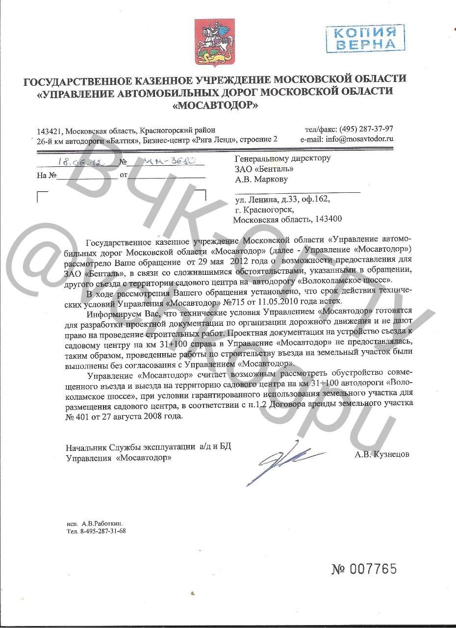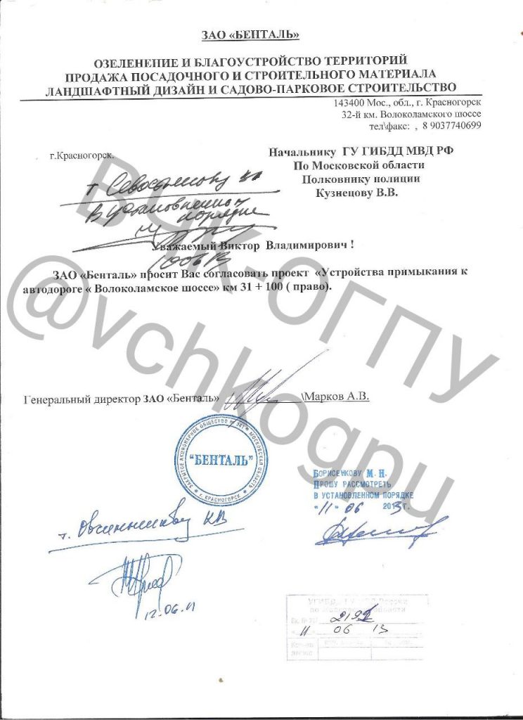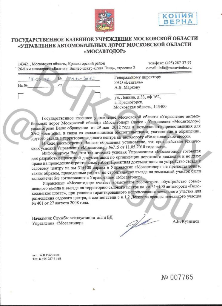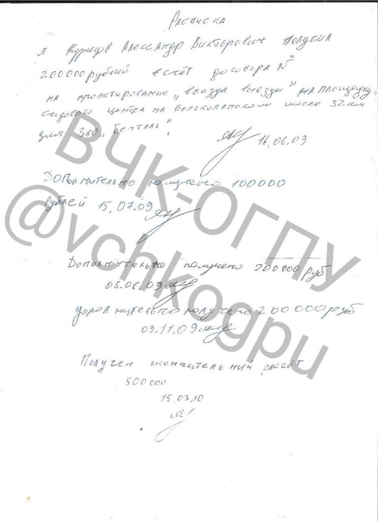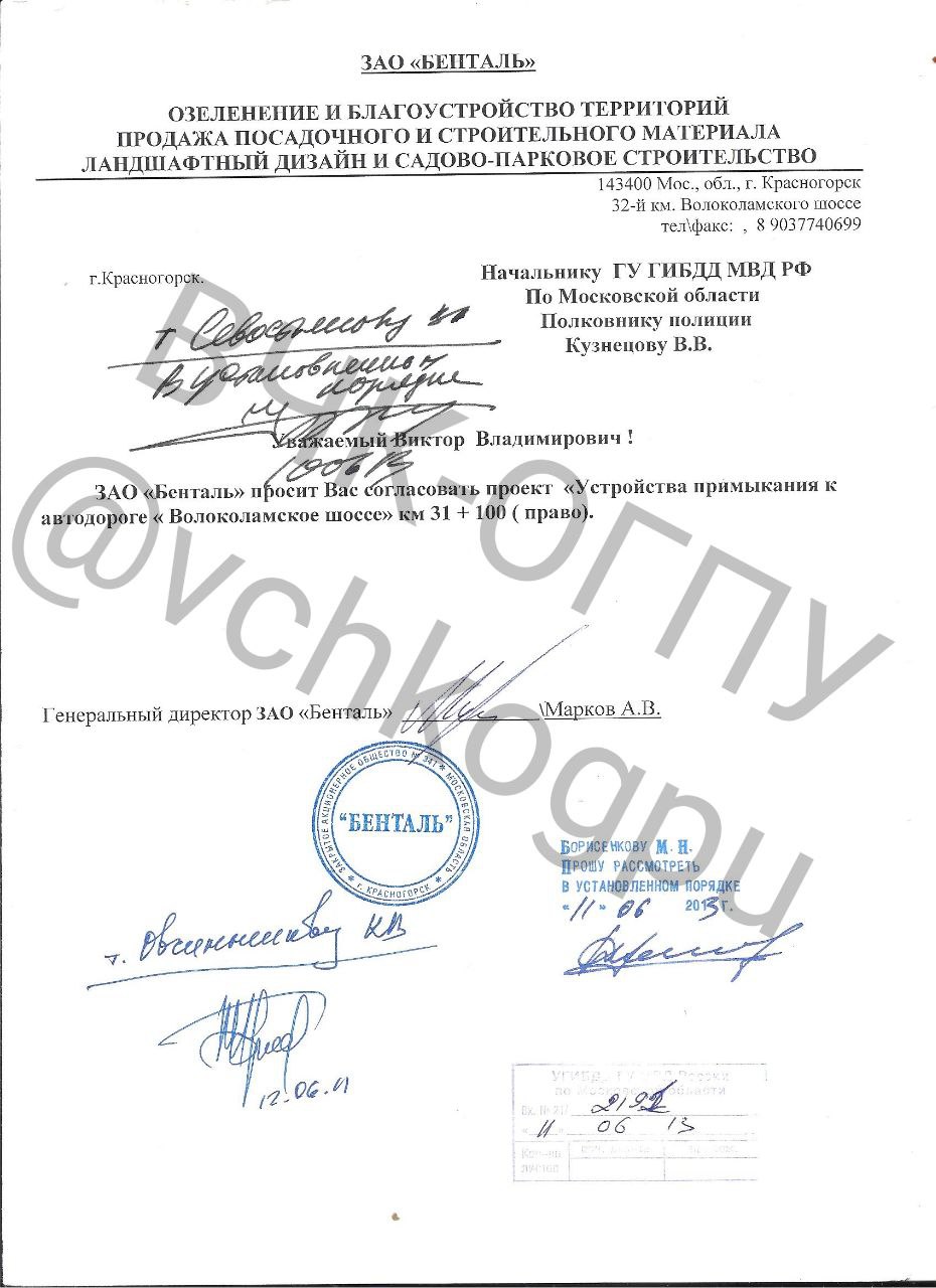 Однако, в декабре 2011 года Александр скоропостижно скончался, а после его смерти выяснилось, что проектная документация на согласование не представлялась, проведенные работы по строительству въезда на земельный участок выполнены без согласования с «Мосавтодор». Далее на Маркова А.В. выходит сват Кузнецова В.В. Самохин А.Н., который за 400.000 рублей вызвался получить для ООО «Бенталь» необходимое согласование и разрешительную документацию. В августе 2012 года Самохин А.Н. передал Маркову А.В. согласованный Кузнецовым В.В. (уже начальником ГАИ Московской области) проект. А уже в сентябре 2013 года по предписанию начальника ОГИБДД УМВД России по Красногорскому району (пришедшему «наследнику» Кузнецова В.В.) «Мосавтодор» ликвидировал въезд на территорию садового центра. Осознавая трудность сложившейся ситуации, Марков А.В. неоднократно предпринимал безуспешные попытки связаться с Кузнецовым В.В. для возврата переданных Александру денежных средств. После официального обращения на имя начальника ГИБДД Московской области с просьбой вернуть переданные средства и предупреждением об обнародовании информации о схеме получения незаконной прибыли и расписку Александра за получение денежных средств в СМИ, Кузнецов В.В. через доверенного подчиненного передал Маркову А.В., что урегулирует данный вопрос. 2.02.2018 Маркову А.В. от имени Кузнецова В.В. в присутствии нотариуса были переданы денежные средства в размере 2.000.000 рублей (с учетом морального ущерба) его доверенным лицом – начальником ОГИБДД ОМВД России по Красногорскому району, о чем составлена нотариальная запись (копия имеется).
