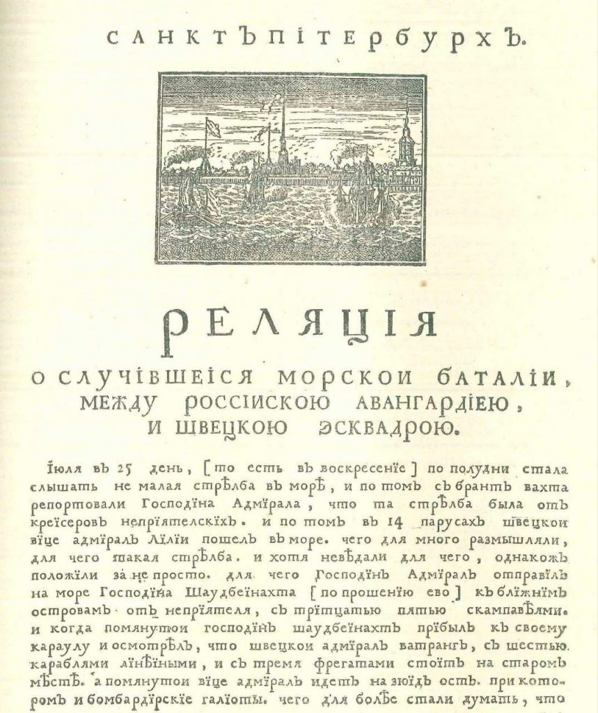 Сегодня в России отмечается День ВМФ. Основы этого праздника были заложены более трёх веков назад – после победы в Гангутской баталии Пётр I повелел отмечать годовщину виктории морскими парадами и фейерверками. Гангутское сражение произошло 27 июля (7 августа) 1714 года. В этой битве русские моряки одержали убедительную победу над шведским флотом. В начале XVIII столетия в России издавалась одна газета – «Ведомости». В ней публиковались военные известия, внутренняя и иностранная хроника. После побед русского оружия газета выпускала реляции, автором которых часто был сам Пётр Великий. Орфография, стиль и манера изложения 300 лет назад сильно отличались от современных сводок. Например, после Гангута «Ведомости» писали: «В 27 день по утру господин наш адмирал со всем при нем будущим флотом, с полуночи пошел, и тогож утра приближася к неприятелю и указ дал пробаватца сквозь оного не огребая кругом, что с помощью Божиею и учинено. И так безвредно, что толко одна скампавея стала на мель, которую неприятель взял. А протчие все как суды так и люди без вреда прошли, хотя со всего флота стреляли по наших над меру жестоко, от которой стрелбы у одного капитана толко ногу отбили…Воистинну нельзя описать мужество наших, ках начальных, так и рядовых.»