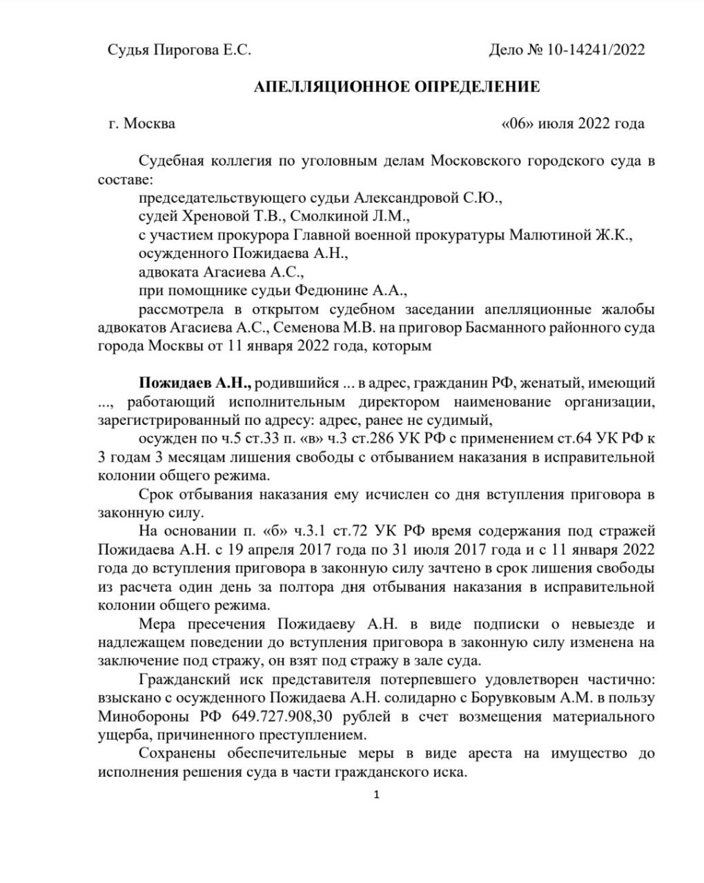 Бывшего офицера продуправления Минобороны Алексея Пожидаева признали виновным в пособничестве превышению должностных полномочий с причинением крупного ущерба (ч. 5 ст. 33, п. «в» ч. 3 ст. 286 УК РФ). По данным следствия, он свел сотрудников управления с бизнесменом Алексеем Калитиным, который, заплатив военным многомиллионные взятки, обеспечил свои компании заказами на много лет. Поскольку Пожидаев рассказал следствию о взятках, обвинение в коррупции с него сняли, назначив всего три года и три месяца колонии по менее тяжкой статье. Меру пресечения в виде подписки о невыезде и надлежащем поведении у него тут же отменили, взяв под стражу в зале суда.