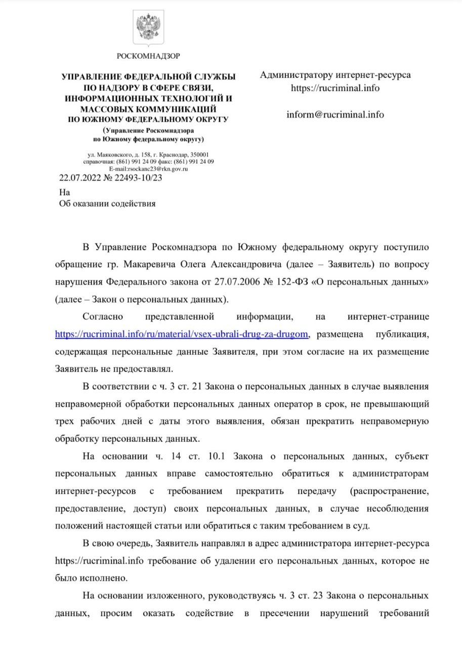 Казалось бы времена проплаченных удалений руками Роскомнадзора закончились, после смены руководства ведомства. Но не в регионах . Кубанский олигарх Олег Макаревич объявлен в розыск за серию преступлений, ориентировки на него были распространеня вместе с фотографией. Понятно, что разыскмваемый человек не хотел бы, чтобы его фото публиковали в СМИ. Что делает Макаревич? Объвляет все свои фото "персональными данными" и требует от СМИ удалить все материалы о нем вместе с ориентировками. СМИ Макаревича посылают. Но не стоит забывать, что на уровне ЮФО он коррумпировал все что можно. И сейчас на помощь Макаревичу спешит Роскомнадзор по ЮФО, который рассылает письма, требуя в качесте "оказания содействия" (кстати, а что это за новая форма такая "оказать содействие") удалить материлы про Макаревича. Ноу-хау для всех разыскиваемых из России и Украины. Спешите в РКН по ЮФО и требуйте удалить ориентировки на себя, так как они содержат личные данные (фото).