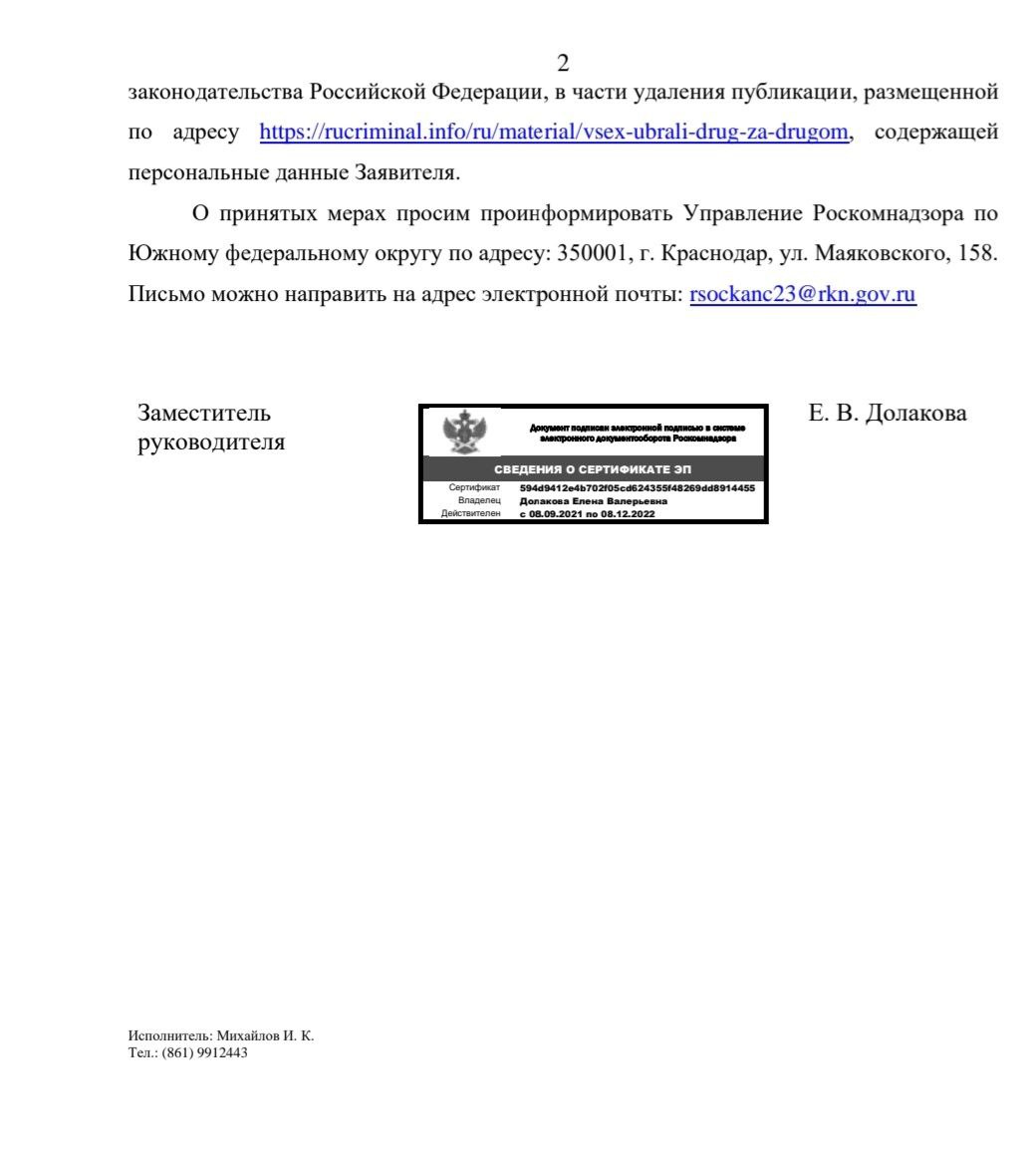 Наша редакция по опыту знает, что через сутки за таким письмом следует блокировка сайта. Временно снимем материал. А от РКН хочется получить объяснение. Что такое "оказать содействие РКН"? И надо ли удалить с сайта фото всех преступников, так как это личные данные?