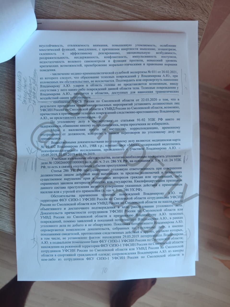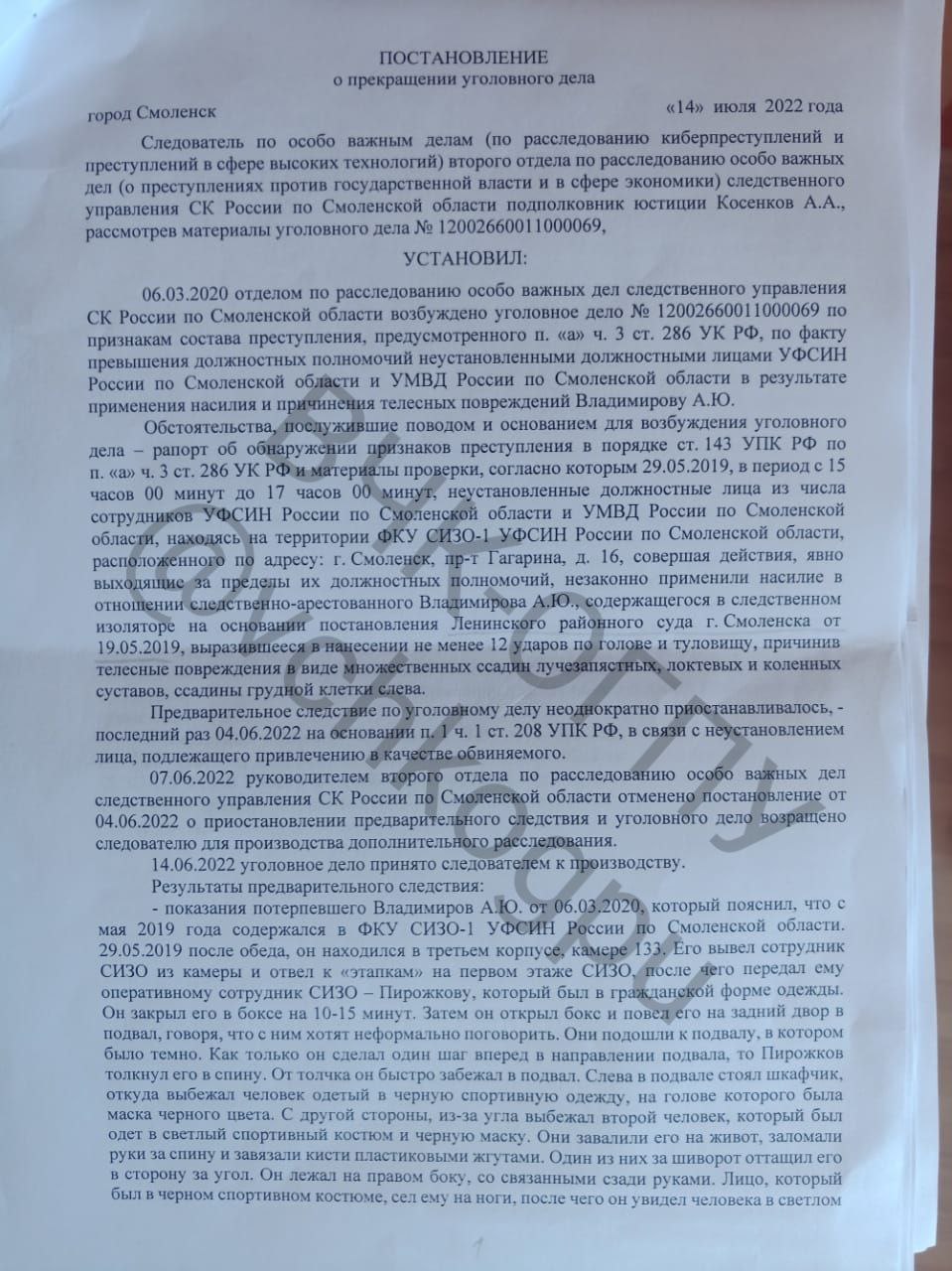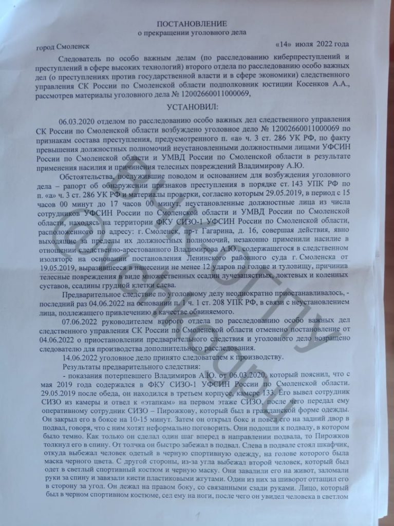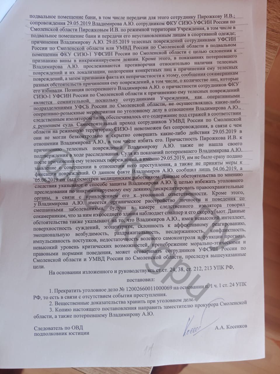 Как стало известно ВЧК-ОГПУ, СУ СКР по Смоленской области прекратил дело о пытках Алексея Владимирова. Так и не обозначенным главным фигурантом дела был и.о. начальника главного управления Генпрокуратуры по надзору за расследованием особо важных дел Евгений Полонский. До того, как занять эту должность он возглавлял прокуратуру Смоленской области и в этот период времени обокрали его служебную квартиру. Прокурор поднял «на уши» всех силовиков, включая УФСБ, и были задержаны мать и сын Владимировы.