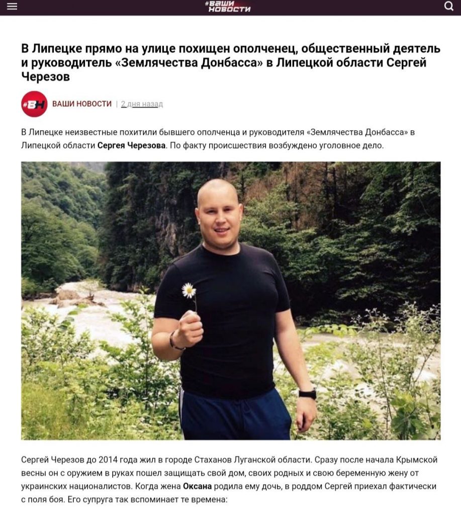 На днях прошла новость о похищении в Липецке «бывшего ополченца и руководителя «Землячества Донбасса» в Липецкой области Сергея Черезова». В статьях описывается его «героическое» прошлое и настоящее. Источникам ВЧК-ОГПУ, «ополченец» известен несколько с другой стороны.