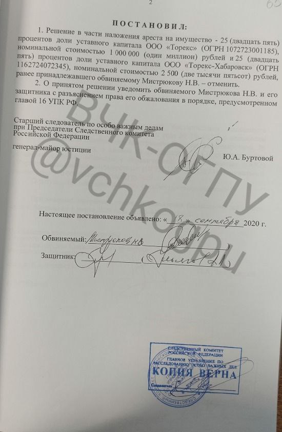 18 сентября 2020 года генерал майор юстиции, руководитель Следственной группы СК РФ господин Буртовой лично отменил арест на доли в «Торекс» и «Торекс- Хабаровск»( Амурсталь) и отпустил Мистрюкова под домашний арест.