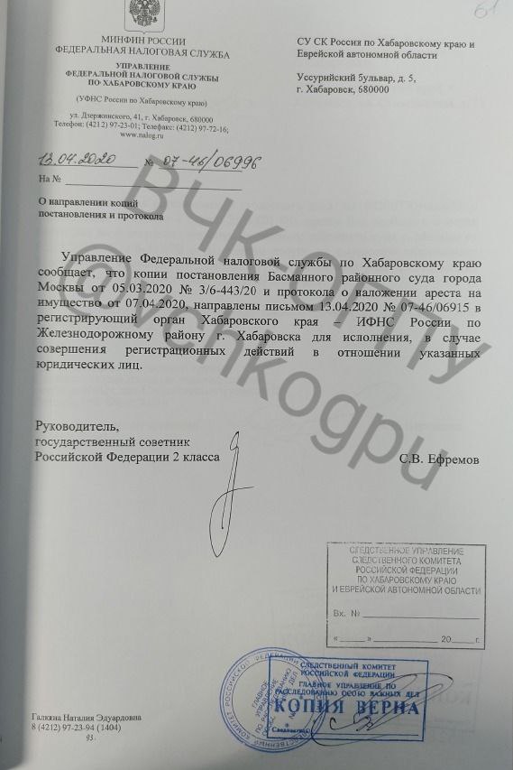 13 апреля 2020 года СУ СК по Хабаровскому краю в лице господина Ефремова сообщил, что копии постановления Басманного суда и наложения ареста на имущество Мистрюкова направлены в ИФНС России по Железнодорожному району г. Хабаровска для исполнения. Однако ИФНС по Железнодорожному району г. Хабаровска ответ дали только 9 сентября 2020 года. В котором сообщили, что представляется невозможным исполнить постановление Басманного суда, потому что Мистрюковым уже отчуждены доли завода «Амурсталь», и что на этом основании поступило заявление от нотариуса Валдаева ещё в феврале 2020 года. Долей в предприятиях больше нет, следовательно арестовать их не получится.