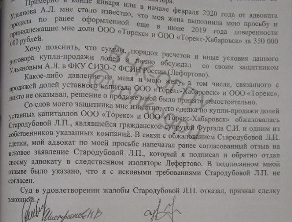 31 января 2020 года будучи в СИЗО Лефортово Мистрюков через свою жену продал Бальскому долю в заводе не за 1,5 млрд, а всего за 300 млн рублей. Остальная сумма со сделки пошла на дальнейшую фабрикацию дела против Фургала и отъем доли завода «Амурсталь» уже у его жены Стародубовой через уголовное дело по экономике.