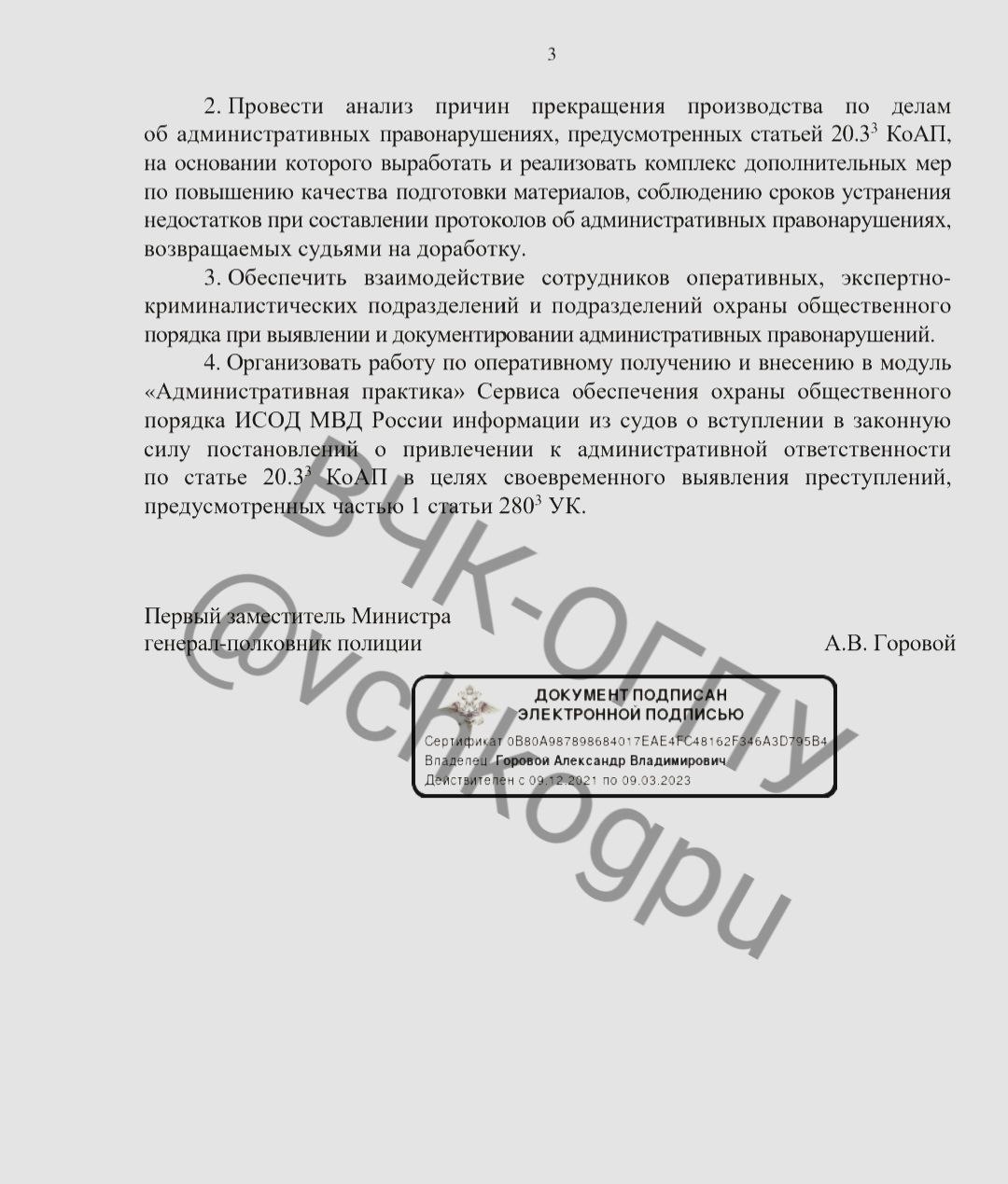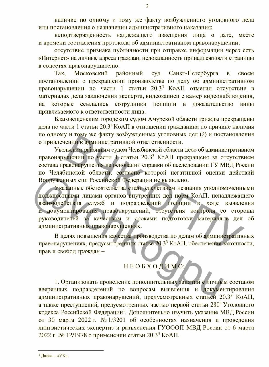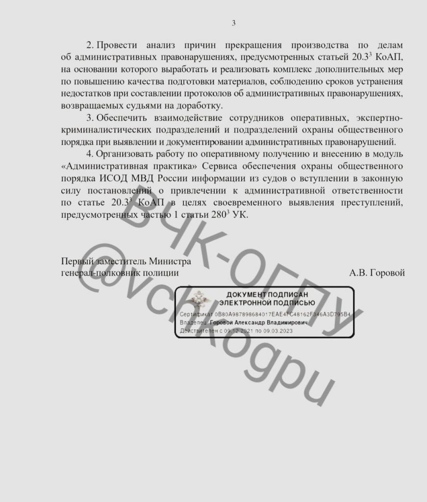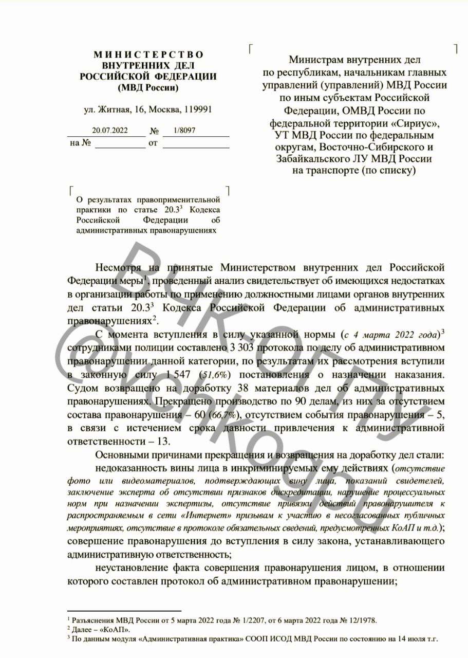 В распоряжении ВЧК-ОГПУ оказался полный текст распоряжения первого замминистра МВД Горового о применении полицией статьи 20.3.3 КоАП (дискредитация вооруженных сил РФ). Согласно данным замминистра, с момента вступления в силу указанной нормы (с 4 марта 2022 года) сотрудниками полиции составлено 3 303 протокола по делу об административном правонарушении данной категории, по результатам их рассмотрения вступили в законную силу 1 547 (51,6%) постановления о назначении наказания.