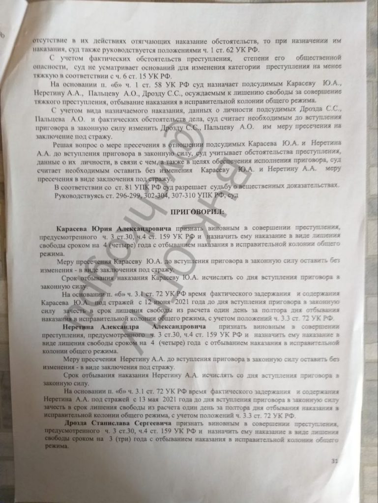 Как стало известно ВЧК-ОГПУ Пресненским судом осуждены к различным срокам лишения свободы Неретин, Карасёв, Дрозд и Пальцев, которые пытались ограбить ГУД ЭНЕРДЖИ в 2020 году. Они дали показания на одиозного бизнесмена Павла Юхвидина, назвав его организатором. Юхвидин успел скрыться из России и дело в отношении него выделено в отдельное производство. Оперативные службы ищут людей, которые могут являться «старшими» для группировок Юхвидина и Меликяна.