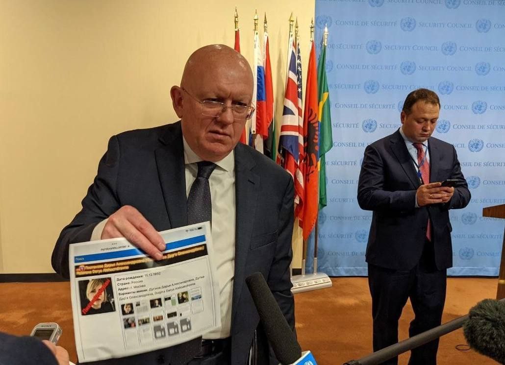 Выступая в ООН, Небензя показал распечатку с украинского сайта Миротворец, на котором портрет Дарьи Дугиной перечеркнут словом "Ликвидирована".