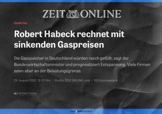 Вице-канцлер ФРГ и министр экономики Роберт Хабек, по его собственным словам, ожидает, что рынки газа скоро успокоятся, и, следовательно, цены снизятся. По словам Хабека, причиной этого является быстрое заполнение газовых хранилищ. Кроме того, Германия тогда больше не будет покупать по любой цене. Об этом пишет Die Zeit.