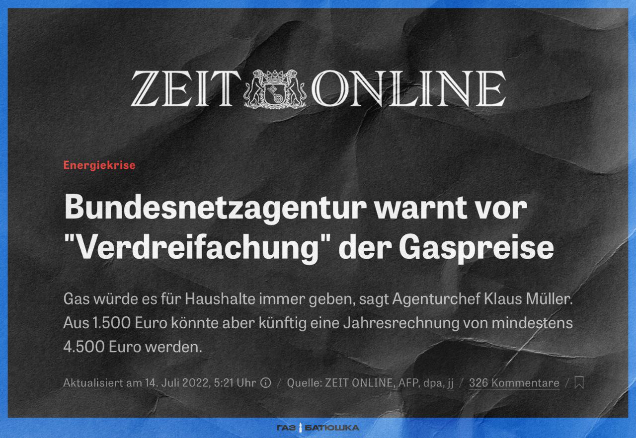 Глава Федерального сетевого агентства Клаус Мюллер предупредил об утроении цен на газ для потребителей или еще более сильном повышении цен. «У тех, кто сейчас получает расчет за отопление, уценки уже удваиваются», - заявил он, отметив, что в цене пока не учтены последствия событий на Украине. По его словам, начиная с 2023 года, «газовые клиенты должны будут приспособиться к утроению цен». Об этом пишет немецкая Die Zeit.